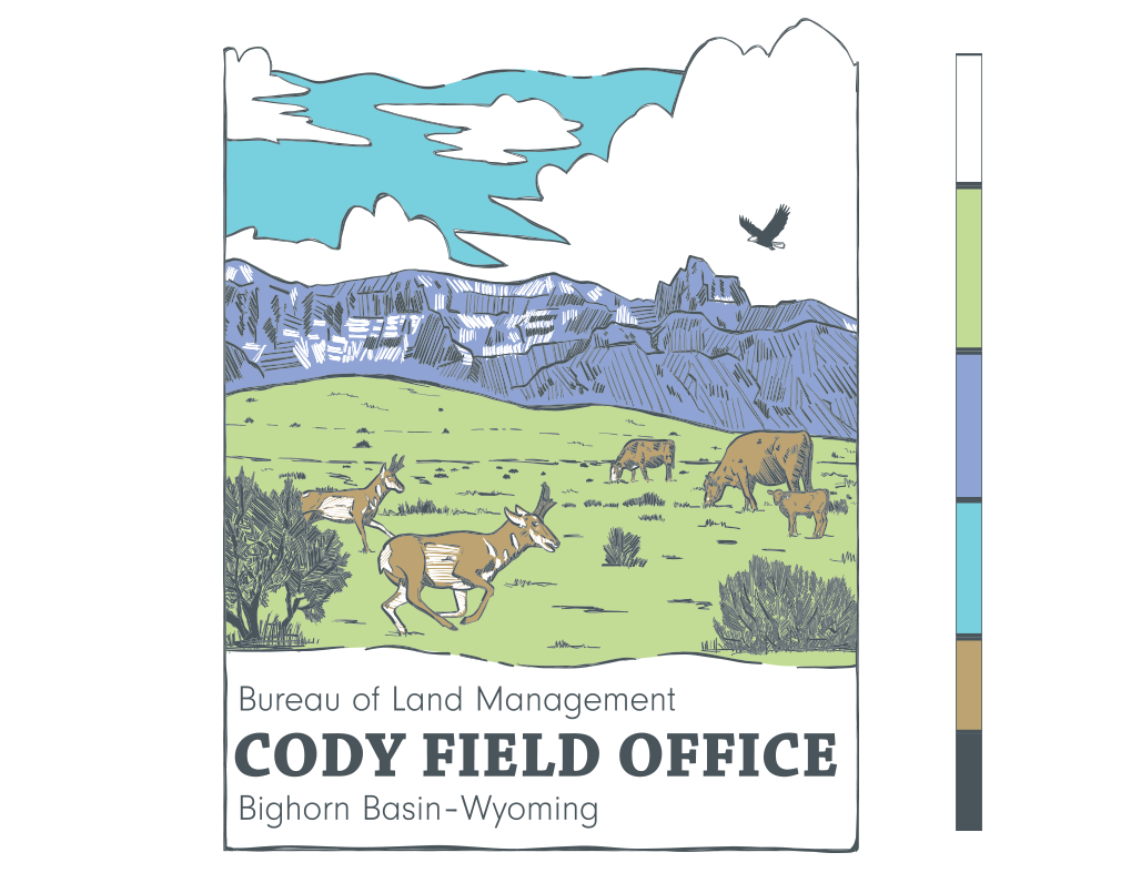 Drew a custom landscape illustration for the BLM Cody Field Office that captures the full scope of their territory: from open feeding plains to ridgeline peaks. The pronghorn in motion balances the composition while keeping the scene alive and active, pulled straight from years of hiking and exploring the eastern slopes of the Rockies. Walked the technical line between detailed linework and a limited color palette that could actually survive the press, turning volunteer and staff apparel into something that reflects the country they spend their days in.